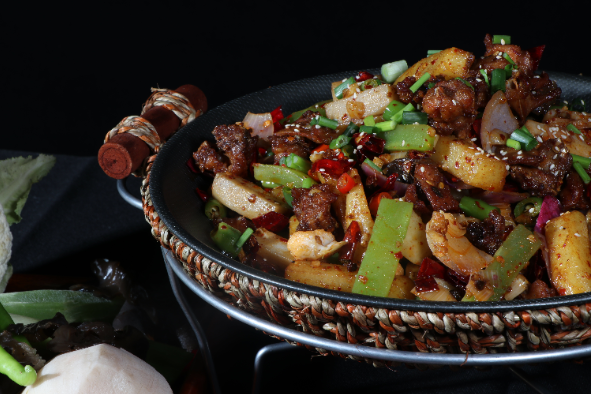 接著將鍋中的食用油撈出,剩余一點底油燒熱,倒入切好的蔥段,生姜末,大蒜末,花椒和干辣椒炒香,后加入一勺辣椒醬翻炒均勻,再加入炸好的牛蛙和土豆快速的翻炒上色,后面再加入適量的料酒,生抽,白糖進(jìn)行調(diào)味,撒上香菜進(jìn)行提香即可。